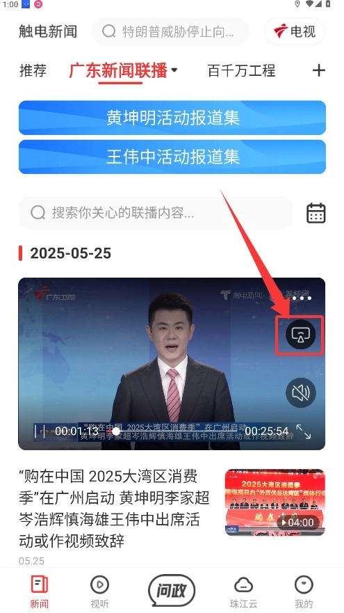 2、在视频播放页面找到新闻联播节目,点击播放按钮后在弹出的菜单中选择投屏功能。