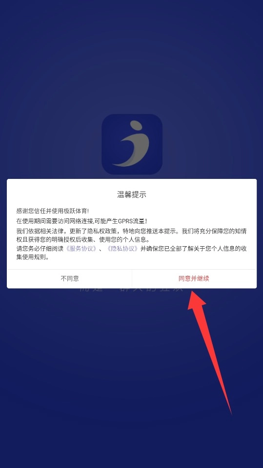 1. 开启极跃体育,首先查看首页的协议内容,若没有问题,点击同意后继续使用。