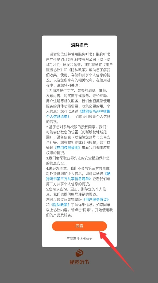 1. 开启酷狗听书,认真研读隐私条款,确认无误后点击同意,随即进入主界面。