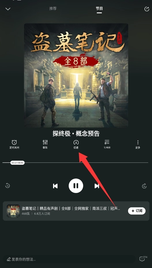 3、播放任意有声书后,点击播放界面的倍速图标,自由调节0.5-2.0倍速。