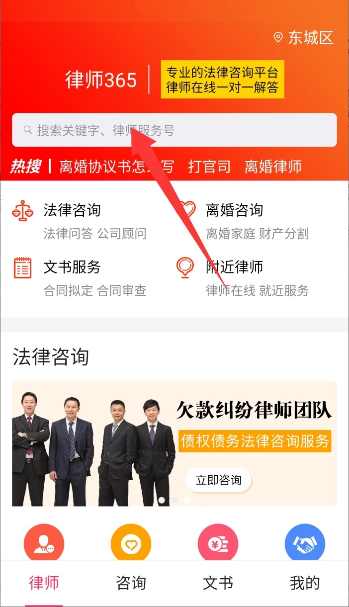 2、在首页顶部的搜索栏,可以通过输入关键词或律师编号快速查找需要的法律服务。