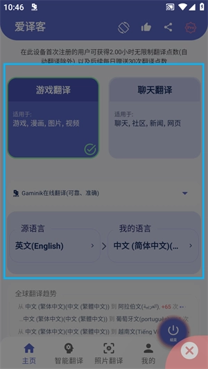 爱译客翻译器堪称一款卓越的屏幕翻译工具。它能够支持多达105种语言的翻译,语言种类丰富至极。无论是游戏、聊天、漫画还是新闻等各类内容,都能轻松实现翻译。其翻译速度极为迅速,翻译结果的准确性也相当出色。不仅如此,它还具备自动翻译、屏幕区域翻译、聊天翻译等多种功能,覆盖范围十分全面。值得一提的是,译文能够完美融入游戏画面,仿佛游戏本身就原生支持该翻译,实用性超强。此外,它还能提供专业的发音测评,并支持智能打分。借助这款软件,用户可以体验语音同声翻译,真正做到即说即译,极大地提升了沟通的便捷性。