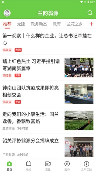 2、登录后,能看到首页、电视、直播、服务、文明实践这五个板块。其中,首页包含推荐、党建、政务动态、教育、兰花之乡、民生、文明实践、乡村振兴等多方面的新闻资讯。