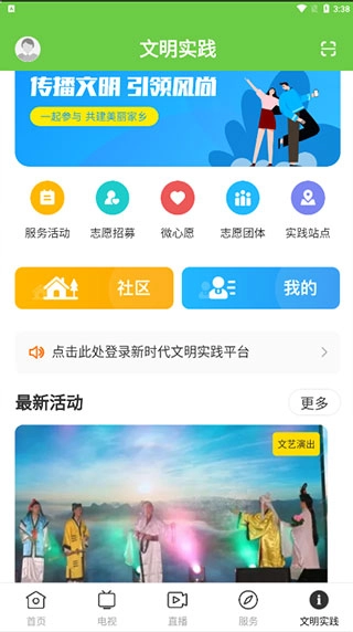 6、文明实践具备服务活动、志愿招募、微心愿、志愿团体、实践站点、社区、我的、最新活动等功能。
