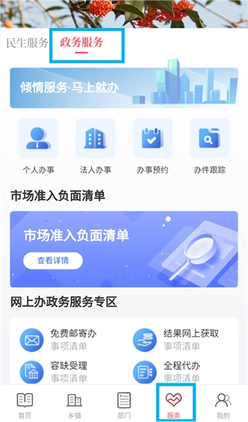 1、在软件内选择服务一栏,点击政务服务。