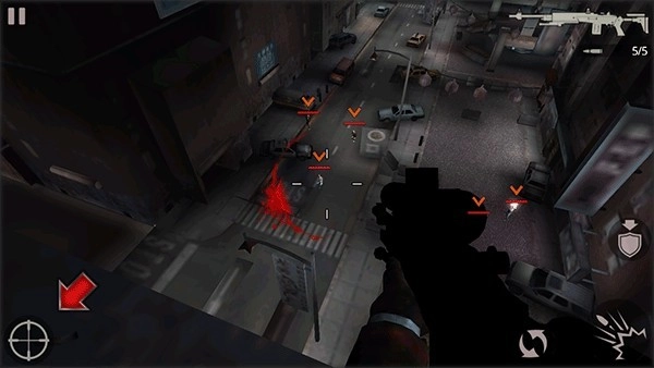 1、安装好游戏,游戏开始我们将身处天台上,并在一个掩护的状态。点击右侧的盾牌箭头图标,主角将站起离开掩护。