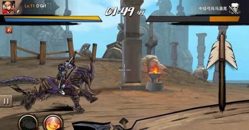只需向下拖动弓箭,便能完成搭箭动作。在搭箭状态下,一旦手指离开点击界面,弓箭即可发射,而且搭箭力度越大,造成的伤害值就越高。除了这种拖动式的弓箭武器,游戏中还有安装式石弓。石弓配备了自动搭箭系统,搭箭完成后,操作方式如同射击类游戏开枪一般,只需点击对应的界面,就能射出箭矢。