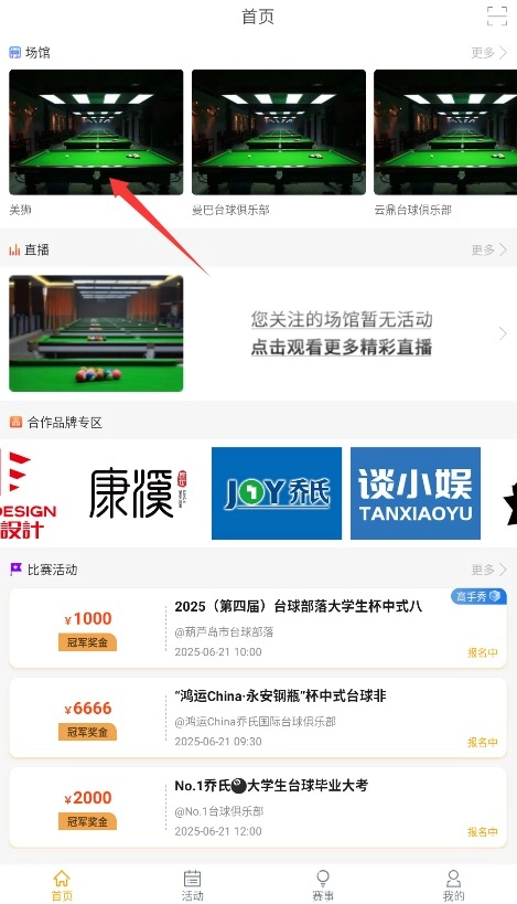 2、在首页界面浏览推荐内容,找到感兴趣的台球赛事视频点击进入播放页面。