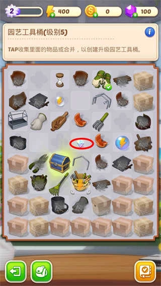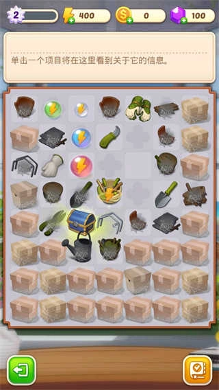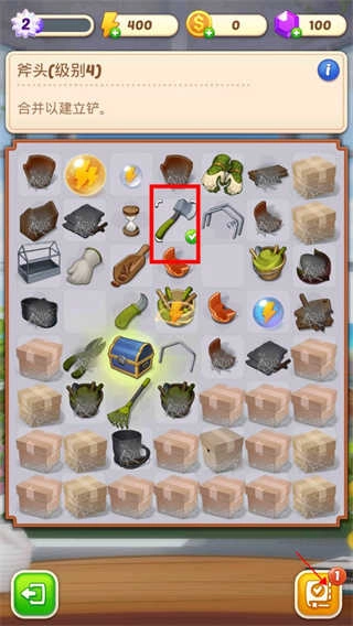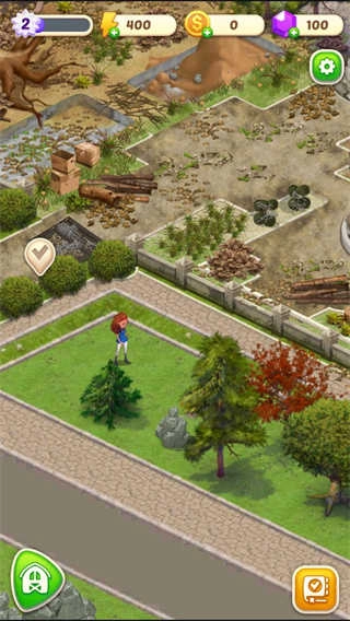 1、大家打开游戏,首先映入眼帘的是庄园一片杂乱,因此我们得着手整理。此时,点击位于中间带有打钩标识的按钮。