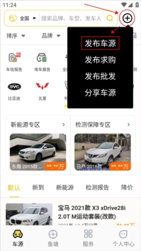 1、在金鱼塘的主页面,点击右上角的“+”按钮,弹出出选框,点击发布车源;