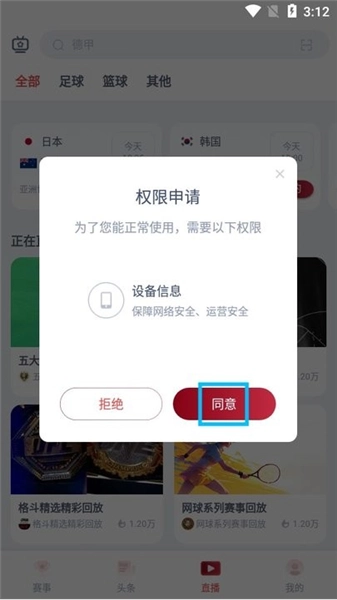 1、打开人人看球,阅读弹出的用户协议和隐私政策;