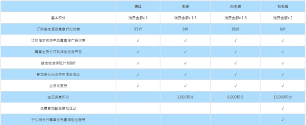 会员共分为四个级别,分别是银级、金级、白金级以及钻石级。每个级别的会员都能尊享一系列专属的旅游礼遇。