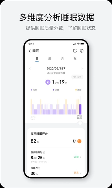 多维度睡眠分析:睡眠质量按日、周、月、年记录,提供详细评分,助改善睡眠。