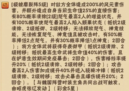 80%概率清除对方怒气值最高的增益,100%概率让对方怒气值最高的武将陷入颤栗状态。强大的技能,可惜怒气值最高的未必是主将,只能说美中不足吧,不过该技能在残局时,效果会更好!