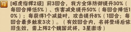 指挥方面,前三回合提升30%防御,减伤提升50%,每获得一个增益攻击提升8%,每回合最多触发三次。再一次提升了张辽的生存能力,输出最高提升百分之二十四,防御也有着不小的提升。