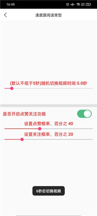4、回到软件首页,点击“速度与概率设置”,在这里既能对视频切换时间进行设置,还能设定点赞概率与关注概率。
