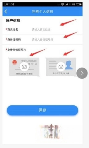 登录之后,尚未认证的用户需要开展身份认证,具体操作是输入姓名以及身份证号,并上传身份证照片,完成后点击保存。