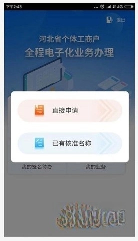 选择个体户开业,系统将弹出提示窗口,提供两种申请方式:直接申请和已有核准名称。