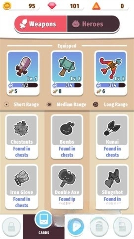 6、于主界面点击“Cards”,查看已解锁的武器,挑选武器进行升级,此过程会消耗金币与经验值。