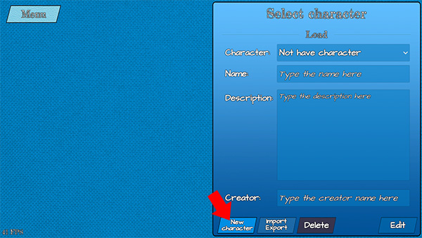 2、进入下图所示界面后,点击下方的“New character”,以此创建我们的新角色(另外,也能够通过“Import/Export”进行角色的导入/导出操作)。