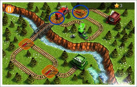 1. 起始阶段,直接点击两个蓝色圆圈所在位置,使两辆火车分别驶入空闲区域,等待合适时机。