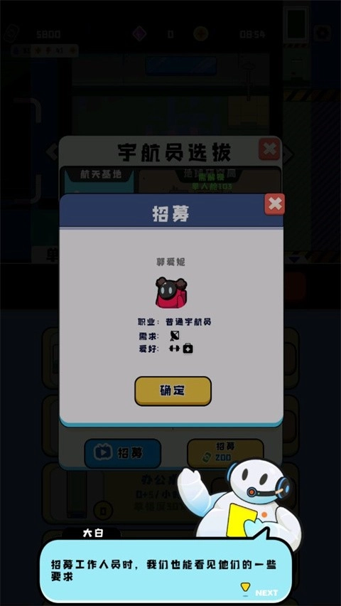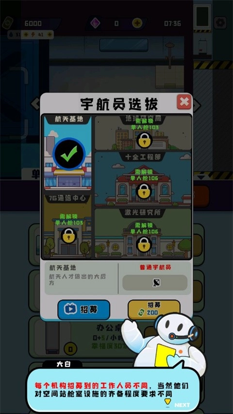 2、空间站要实现收益,离不开各类工作实验的开展。不过,若想让收益达到最大化,还得靠您持续进行扩建。只要有工作成员参与,收益自然就会产生。不妨先招聘一位工作成员吧!