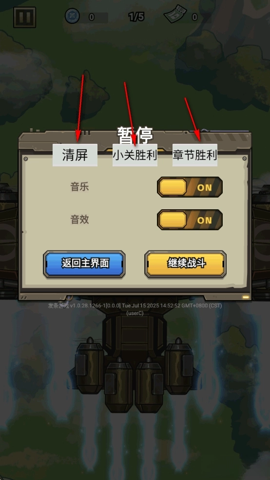 你还能点击左上角所示按钮,从中选择【清屏】【小关胜利】【章节胜利】这些作弊功能。