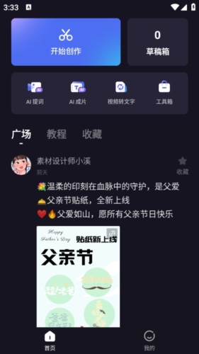 「AI文案」:选择文案类型,输入创作主题和创作角度,即刻生成文案初稿,审核修改即可一键成片。