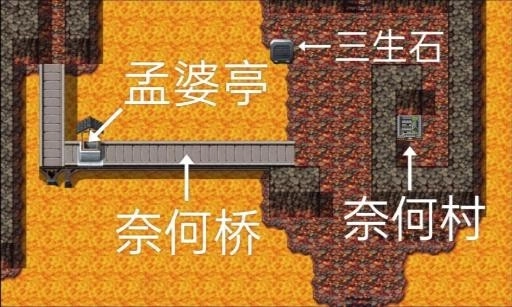 过一段剧情来到地狱,进入奈何村。对话搜刮更新装备买好药品,钱不够可以等石泉谷再买。五周目及以上有木吒时右下角房子柜子调查得返魂丹,墙壁窟窿处进入对话换木吒坐骑木牛。左上去望乡亭,对话亭子过一段剧情。后面剧情九龙镇修桥的会一并修桥,可去陈塘关右边山洞拿蛇矛(十分重要)。出村过奈何桥路过孟婆亭,过完桥就不能回去。