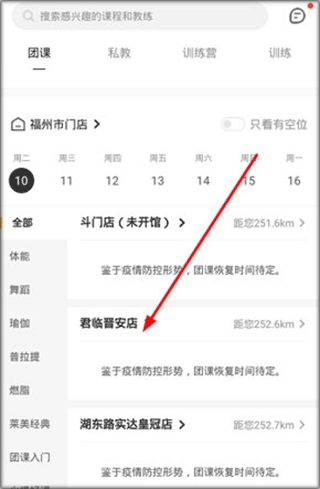 开启定位权限查找附近健身门店并切换感兴趣的门店;