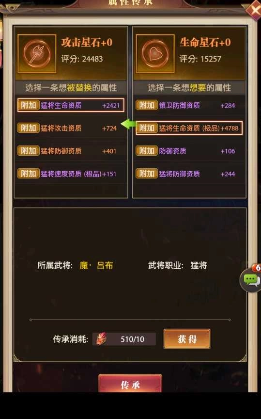 输出类猛将/谋臣:词条方面,可挑选双攻击极品橙色词条(普通攻击词条 + 猛将/谋臣攻击词条)以及双速度极品橙色词条(普通速度词条 + 猛将/谋臣速度词条)