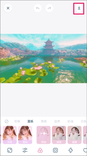 2、在图片处理界面底部,选好你要加工的类型。在此处,大家不仅能添加贴纸,还能调整颜色深度(加大或减少),以此对图片进行美化。完成图片加工后,大家可选择并点击右上角的“ ”选项,保存自己的图片。