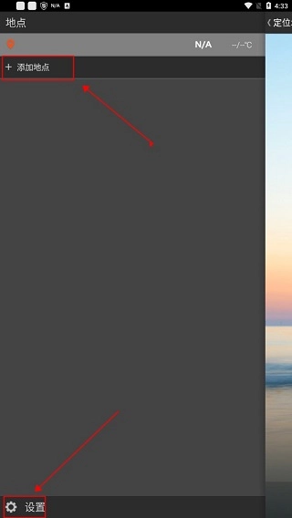 在界面左侧滑动,在“添加地点”处,你能够了解感兴趣国家和地区的天气变化情况。此外,这里还设有设置功能,点击即可进入系统设置。