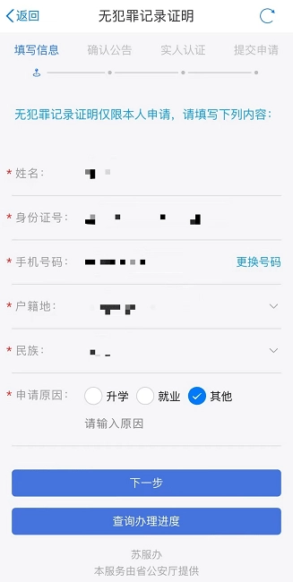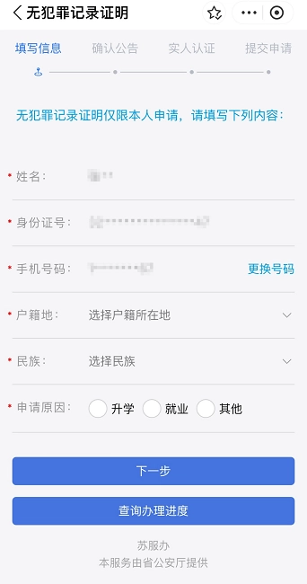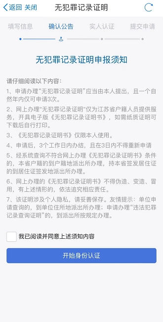 按要求填写信息,进入下一步,阅读无犯罪记录证明申报须知。
