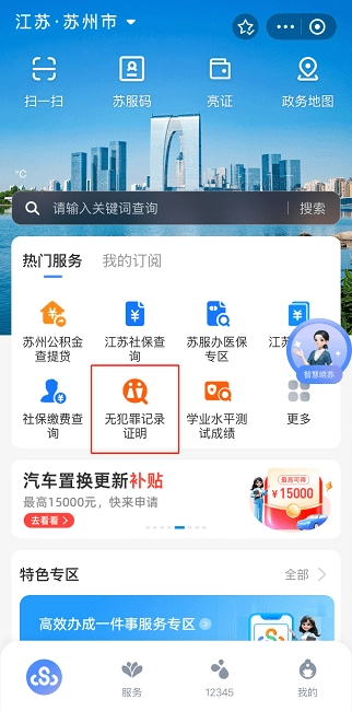 登录苏服办之后,在首页搜索“无犯罪记录证明”进入服务;