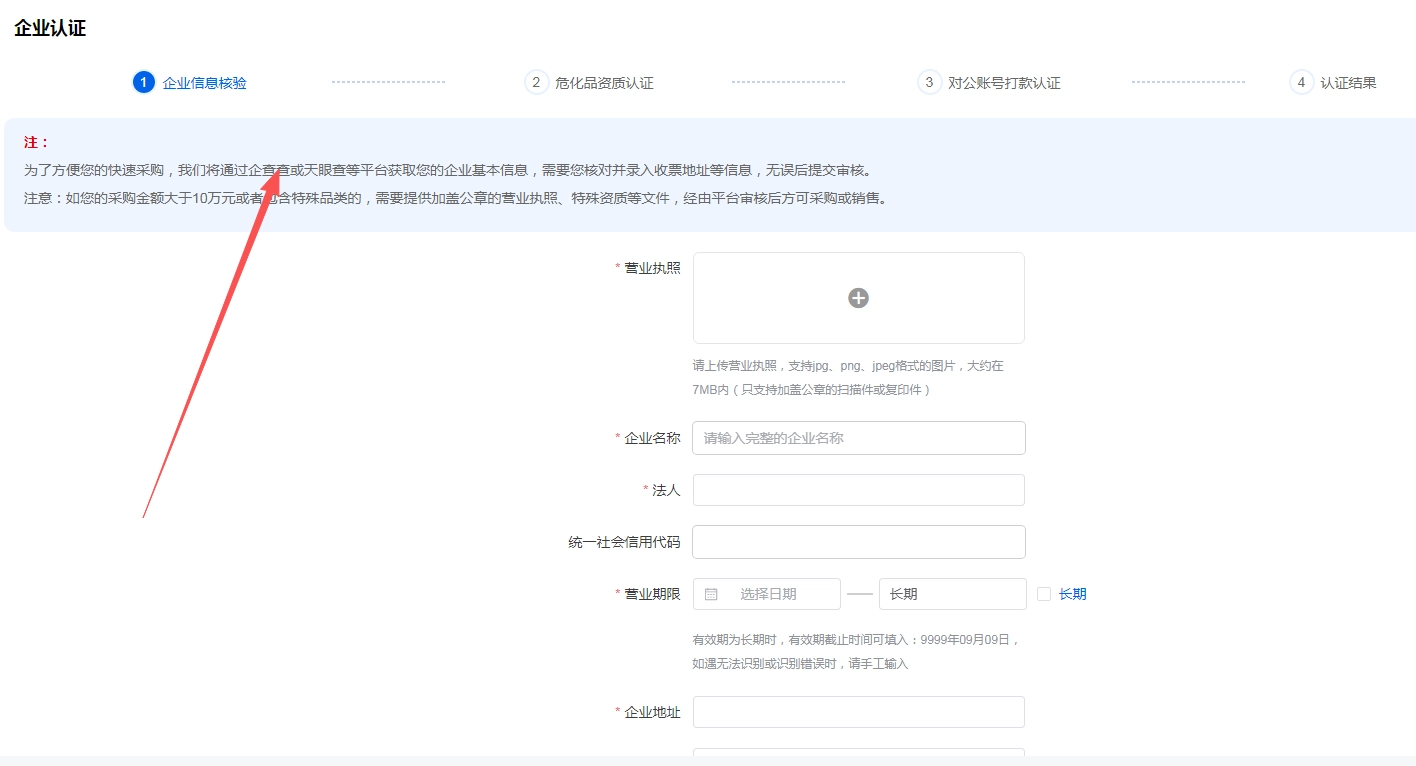注意:如您的采购金额大于10万元或者包含特殊品类的,需要提供加盖公章的营业执照、特殊资质等文件,经由平台审核后方可采购或销售。