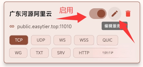 7、接着点击“启用”按钮旁的“编辑服务器”,务必勾选TCP和UDP协议。