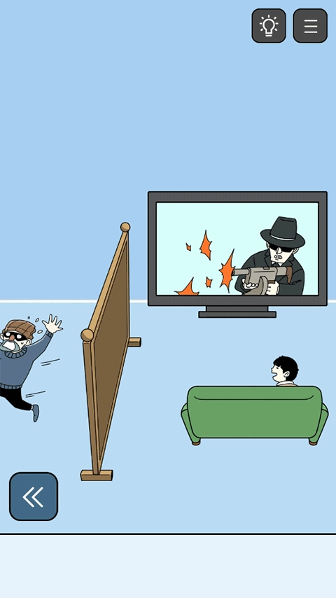 然后我们看到他本来看得侦探片,直接点击开始,小偷进来之后,电视里的侦探会射击,小偷就被吓跑了。