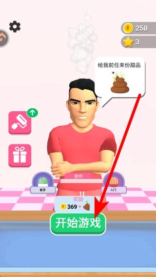 1、进入游戏后,点击开始游戏,会收到顾客的订单,比如有顾客想要一份搞怪的便便形状甜品,此时需根据需求准备制作。