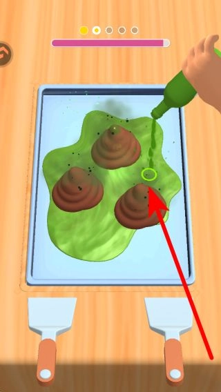 2、首先进行食材的调配与加工,像往制作容器里倒入绿色的酱料等材料,为后续塑造甜品造型做准备,这一步要注意材料的用量与搭配。