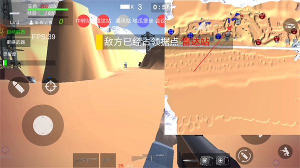 2、点击左下方移动按钮操控角色,在沙漠场景中移动寻找敌人。
