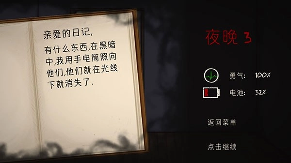 5、每渡过一个恐怖的夜晚,结束之后,大家就可以查看到艾琳娜剩余的勇气值与电池电量。