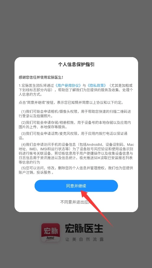1. 开启宏脉医生,在阅读且同意用户协议以及隐私政策之后,点击“同意并继续”,进而进入登录界面。
