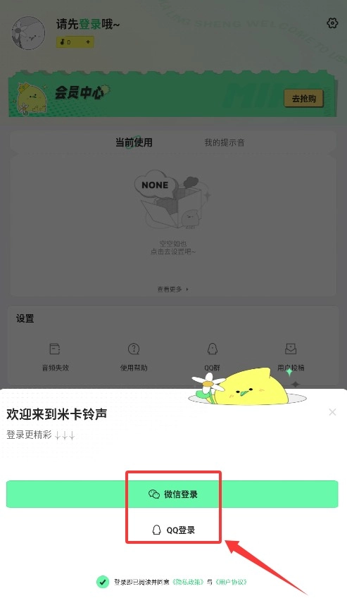 1. 开启米卡铃声,于登录页面挑选微信或QQ账号,通过第三方授权实现快速登录。