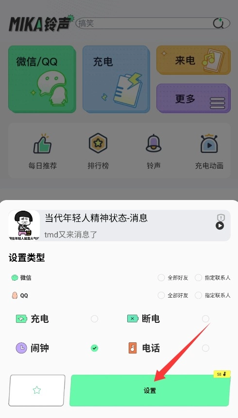 2、进入推荐频道浏览精选铃声,点击心仪的铃声后选择右下角设置按钮。