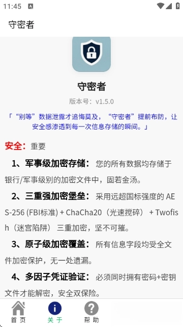 4、点开“关于我们”页面,便能查看软件加密技术说明、隐私政策以及版本信息,以此保障用户的知情权,让用户安全使用。