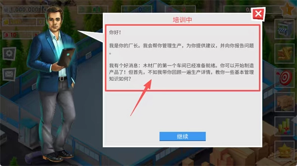 1、弹出图片对应的对话栏,点击下方蓝色的“继续”按钮,即可持续进行游戏,后续厂长会教你学习管理与生产方面的知识。