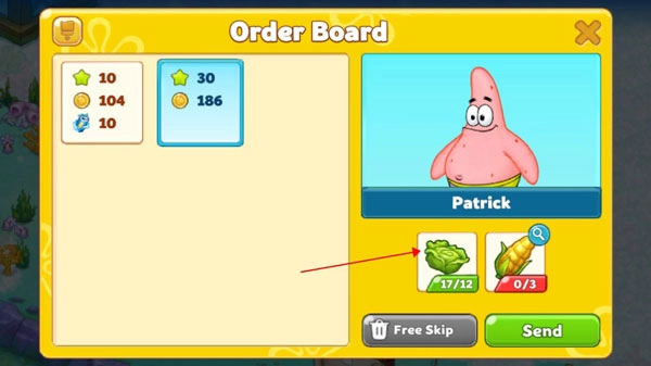 进入“订单栏”,了解角色当前需求(如派大星需要生菜),前往对应区域采集或种植。