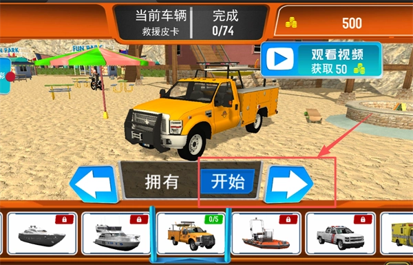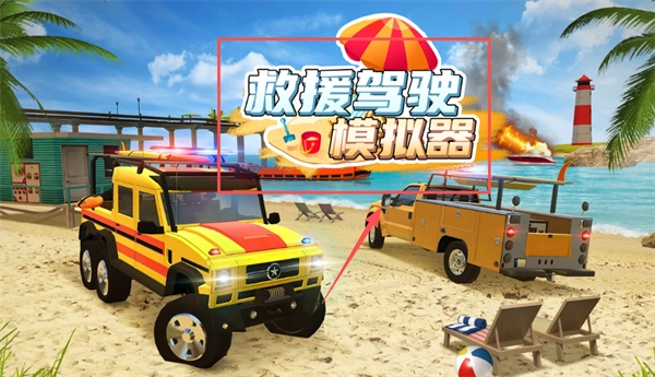 1、点击画面下方中间红色的“救援驾驶模拟器”标题区域,或者留意沙滩救援场景中的元素。