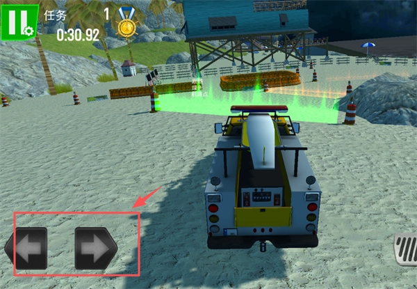4、通过点击左右方向箭头来操控黄白工程车移动,也可依照上方任务时间及航路点的提示进行行驶。